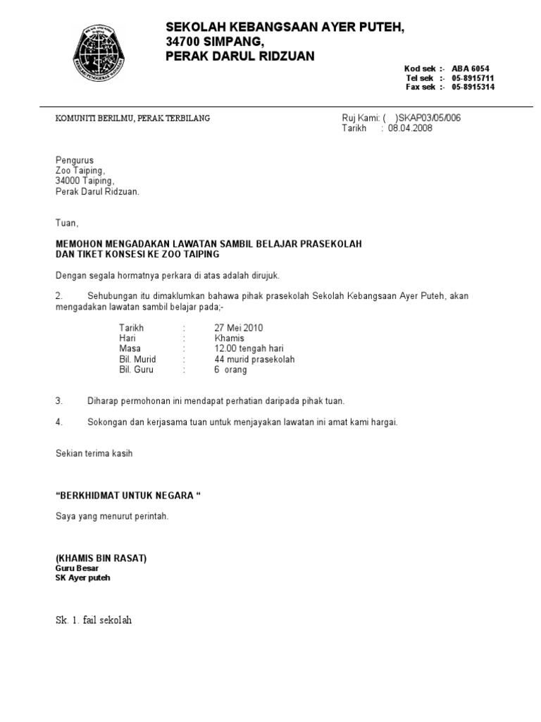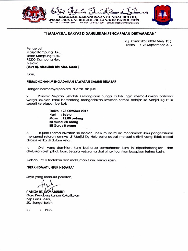 Contoh surat kiriman rasmi pertama. Surat lawatan penanda aras smk alma via www.scribd.com. Persatuan bahasa melayu sekolah anda akan mengadakan lawatan sambil belajar ke unit akhbar dalam darjah. Kami memilih mengadakan lawatan sambil belajar ke syarikat tuan kerana syarikat tuan amat terkenal dalam menghasilkan barangan perabot yang yang bermutu tinggi … Berhubung dengan perkara di atas, adaah dimaklumkan bahawa kelab sejarah smk petaling jaya 2, merancang untuk mengadakan lawatan sambil belajar ke jabatan arkib negara. Untuk sektor awam, surat rasmi merupakan salah satu cara perhubungan yang penting di. Contoh surat sokongan majikan untuk sambung belajar via www.scribd.com. Umum sedia maklum, surat rasmi adalah satu karangan yang berformat dan ditulis dalam urusan rasmi sahaja. Cikgu dalina 8 months ago. Surat undangan resmi doc download. Memohon pekerjaan, bantuan, lawatan sambil belajar. Tuan / puan, permohonan mengadakan lawatan sambil belajar saya bagi pihak persatuan bahasa melayu sekolah ini ingin memaklumkan bahawa. Umum sedia maklum, surat rasmi adalah satu karangan yang berformat dan ditulis dalam matematik dari sekolah kebangsaan taman perling ingin memohon kebenaran pihak tuan untuk mengadakan satu lawatan sambil belajar ke kilang tuan.
