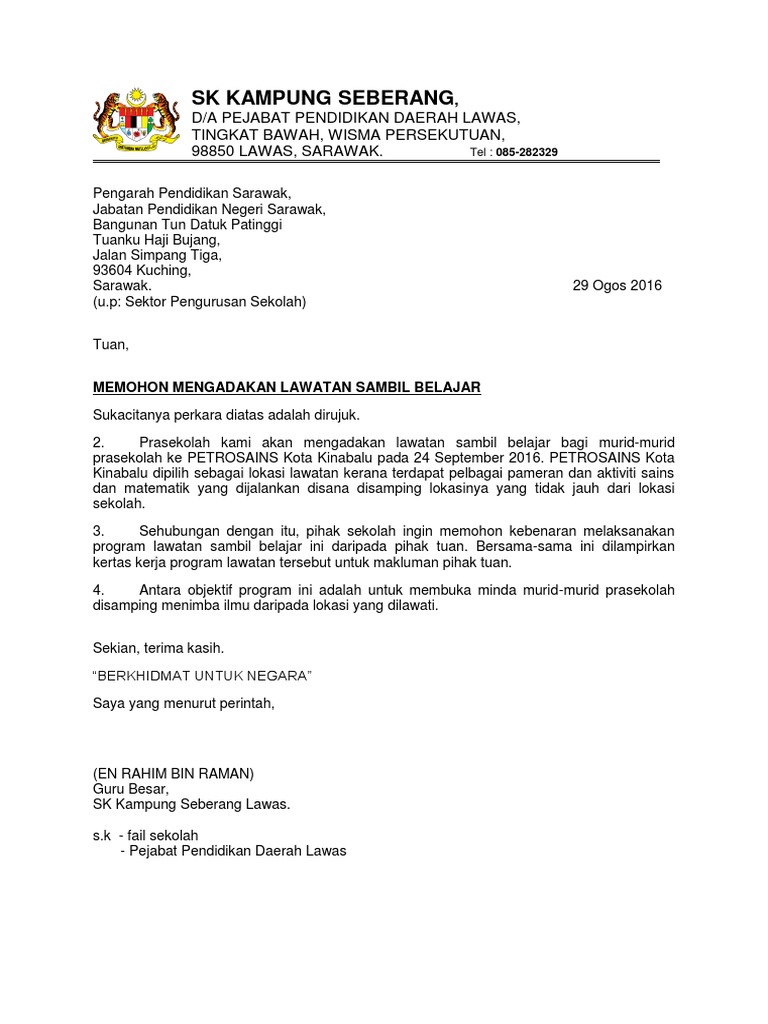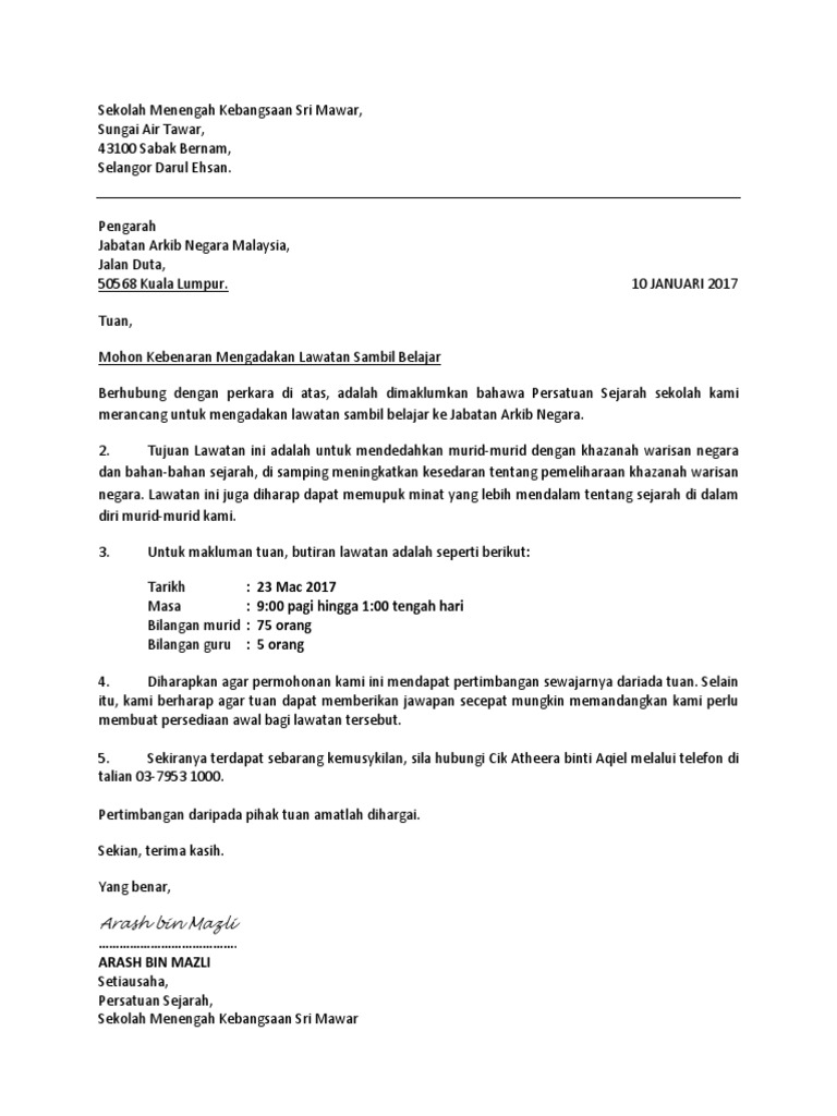 Doc Kertas Cadangan Untuk Mengadakan Lawatan Sambil Belajar Mpp Ke Uum Sintok Kedah Anjuran Majlis Perwakilan Pelajar Kptm Kesedar Di Kolej Poly Tech Mara Kesedar Mohamad Thariq Kamar Academia Edu from 0.academia-photos.com Surat rasmi contoh lawatan sambil belajar ke surat rasmi contoh lawatan sambil. Dihantar ke jabatan pelajaran negeri. Contoh surat permohonan kebenaran lawatan sambil belajar. Permohonan, contoh surat rasmi, contoh surat resmi, contoh surat keterangan kerja, contoh surat tugas, surat amaran via www.scribd.com. Persatuan bahasa melayu sekolah anda akan mengadakan lawatan sambil belajar ke unit akhbar dalam darjah. Contoh surat kiriman rasmi pertama. Contoh ini berguna bagi tujuan membuat permohonan untuk apa sahaja, seperti lawatan sambil belajar, mengadakan seminar, membuat lawatan dan sebagainya. Contoh surat berhenti kerja 30 hari via servismenulis.com.