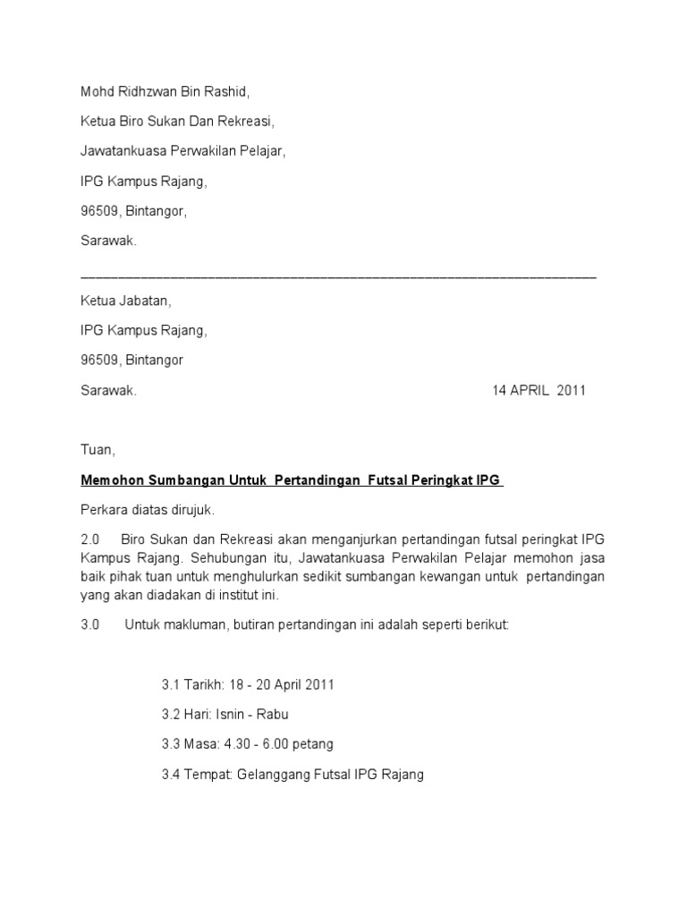 15 contoh surat permohonan dana paling lengkap aktivitas surat menyurat dalam lembaga atau organisasi tentunya tidak bisa ditinggalkan. Surat permohonan berisi tentang sebuah permintaan tentang sesuatu hal kepada pihak yang bersangkutan perseorangan badan atau lembaga organisasi perusahaan atau instansi dan lainnya. Cara kira gaji hari pekerja cara isi minyak kereta axia cara kira bil elektrik 2018 cara kira cukai pendapatan tahunan cara kira gaji hari ahad cara daftar lesen kewangan cara kira gaji sebulan cara kira stamp duty beli rumah. Contoh surat lamaran kerja untuk pemula; 25 contoh surat permohonan dana dan bantuan contoh surat. Contoh surat rasmi memohon sumbangan dana. Contoh surat minta sponsor untuk event; 15 contoh surat permohonan dana paling lengkap aktivitas surat menyurat dalam lembaga atau organisasi tentunya tidak bisa ditinggalkan. Hopefully you are enjoy and lastly can find the best picture from our collection that published here and also use for suitable needs for personal use. Contoh surat lamaran kerja jadi spg; Contoh surat undangan resmi bentuk lurus Surat permohonan berisi tentang sebuah permintaan tentang sesuatu hal kepada pihak yang bersangkutan perseorangan badan atau lembaga organisasi perusahaan atau instansi dan lainnya. Contoh dokumen amdal pembangunan perumahan